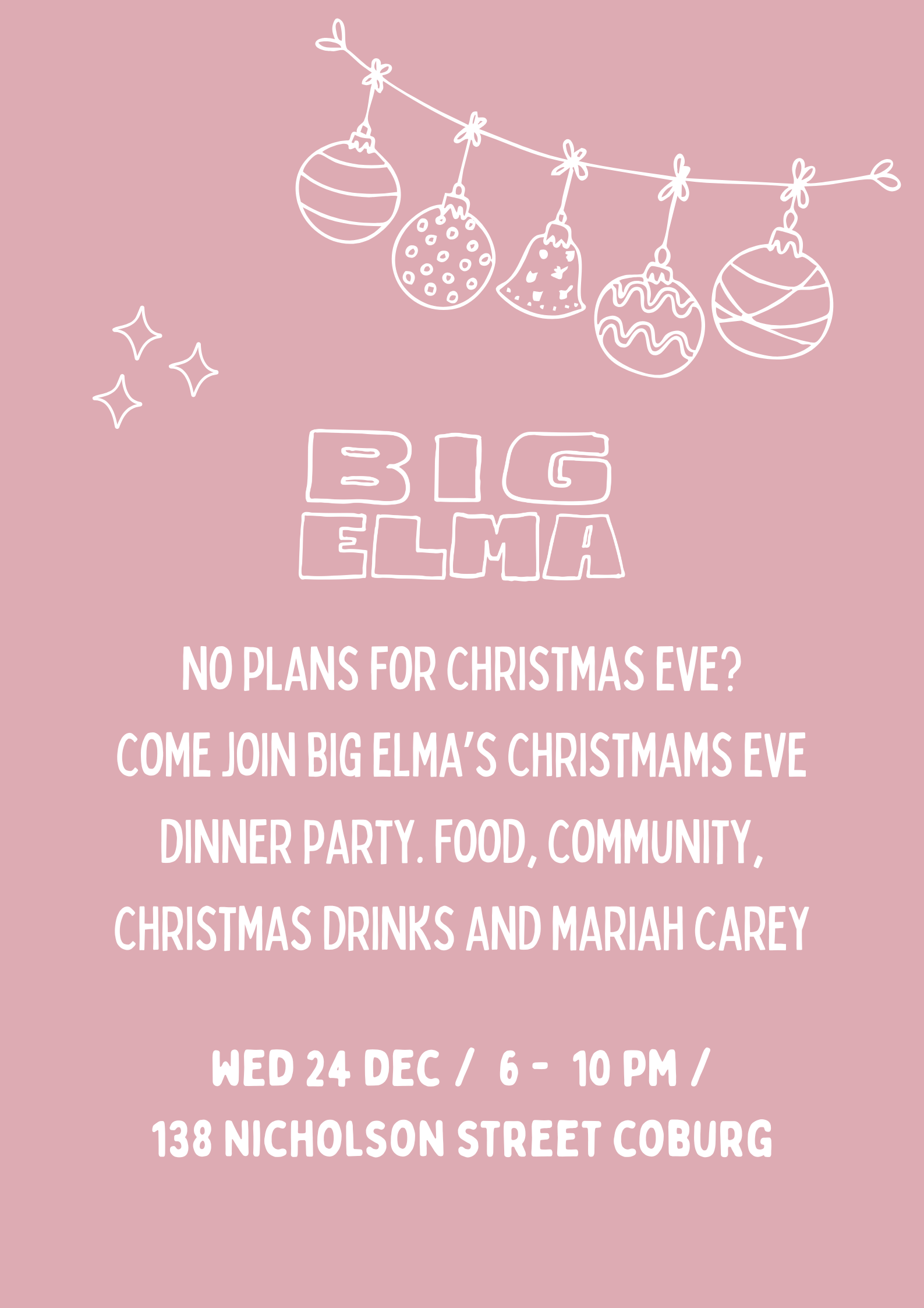 Our Next event is the Big Elma Christmas Eve dinner on December 24. There will be lots of delicious food, space to meet new people in the Coburg community, warmth, love and Mariah Carey tunes. Find more information and tickets in the button below. Merry Christmas!